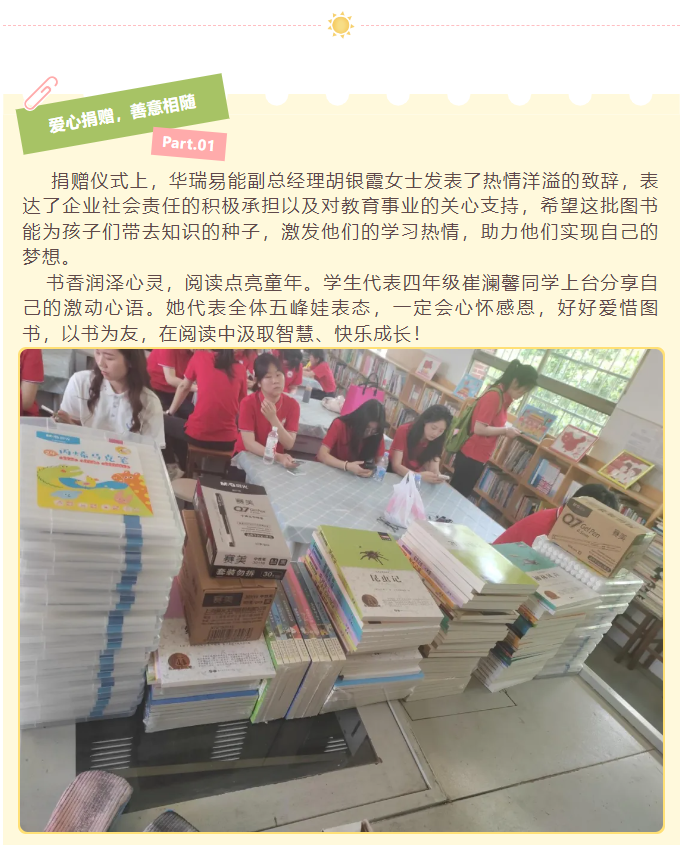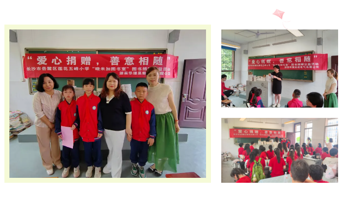 5月6日上午,在曉米加教育工作室梁曉博士的組織下,湖南華瑞易能電氣有限公司副總經(jīng)理胡銀霞及工會(huì)主席張燦輝來(lái)到長(zhǎng)沙市岳麓區(qū)蓮花五峰小學(xué),代表華瑞易能向?qū)W校捐贈(zèng)書(shū)籍。