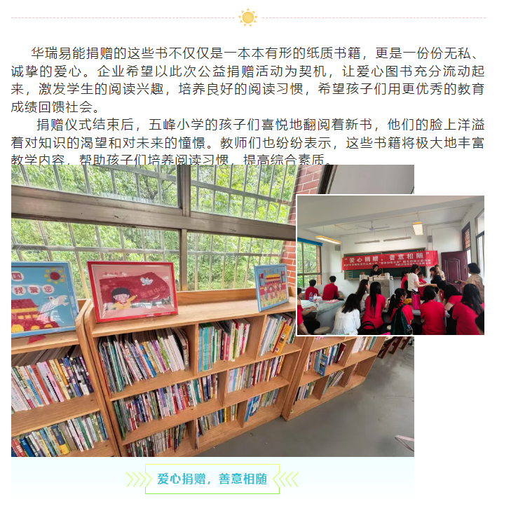 此次捐贈(zèng)活動(dòng)為學(xué)校帶去了寶貴的圖書(shū)資源,這批涵蓋科普、文學(xué)、歷史等領(lǐng)域的優(yōu)質(zhì)讀物,滿(mǎn)足了校內(nèi)多年齡段學(xué)生不同的閱讀需求,不僅承載著企業(yè)的殷切期盼,更將為鄉(xiāng)村孩子打開(kāi)探索世界的窗口。當(dāng)書(shū)籍從愛(ài)心企業(yè)傳遞到求知少年手中,一場(chǎng)關(guān)于知識(shí)的接力正在溫暖上演。